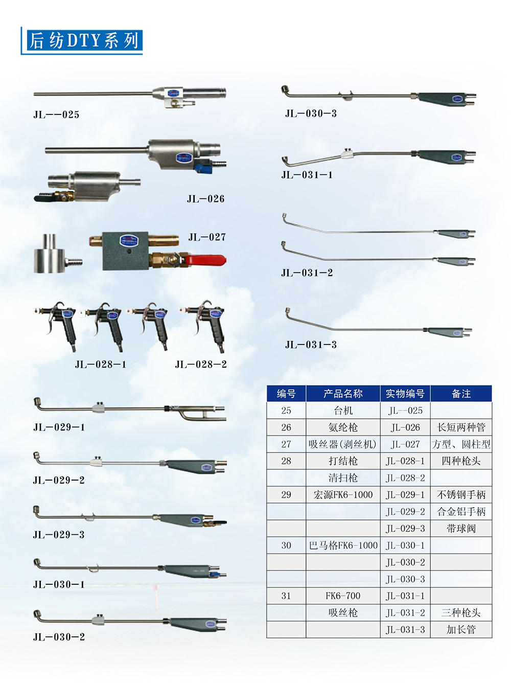 主營各種系列吸絲槍和各種規格快速插座、升絲拉桿為主。吸絲槍主要包括高速紡FDY、 POY、短絲槍、工業絲槍,包括紡DTY、加彈機系列。來圖來樣生產。